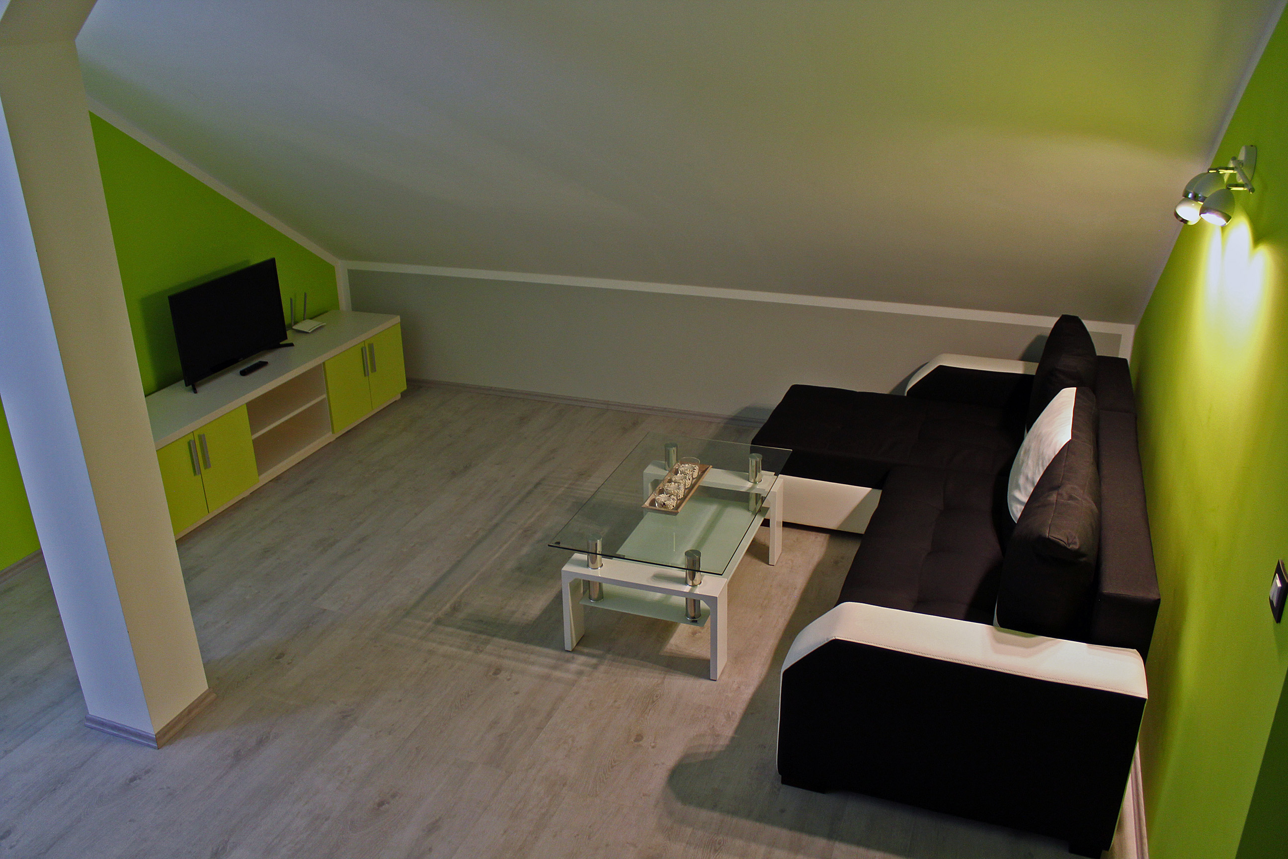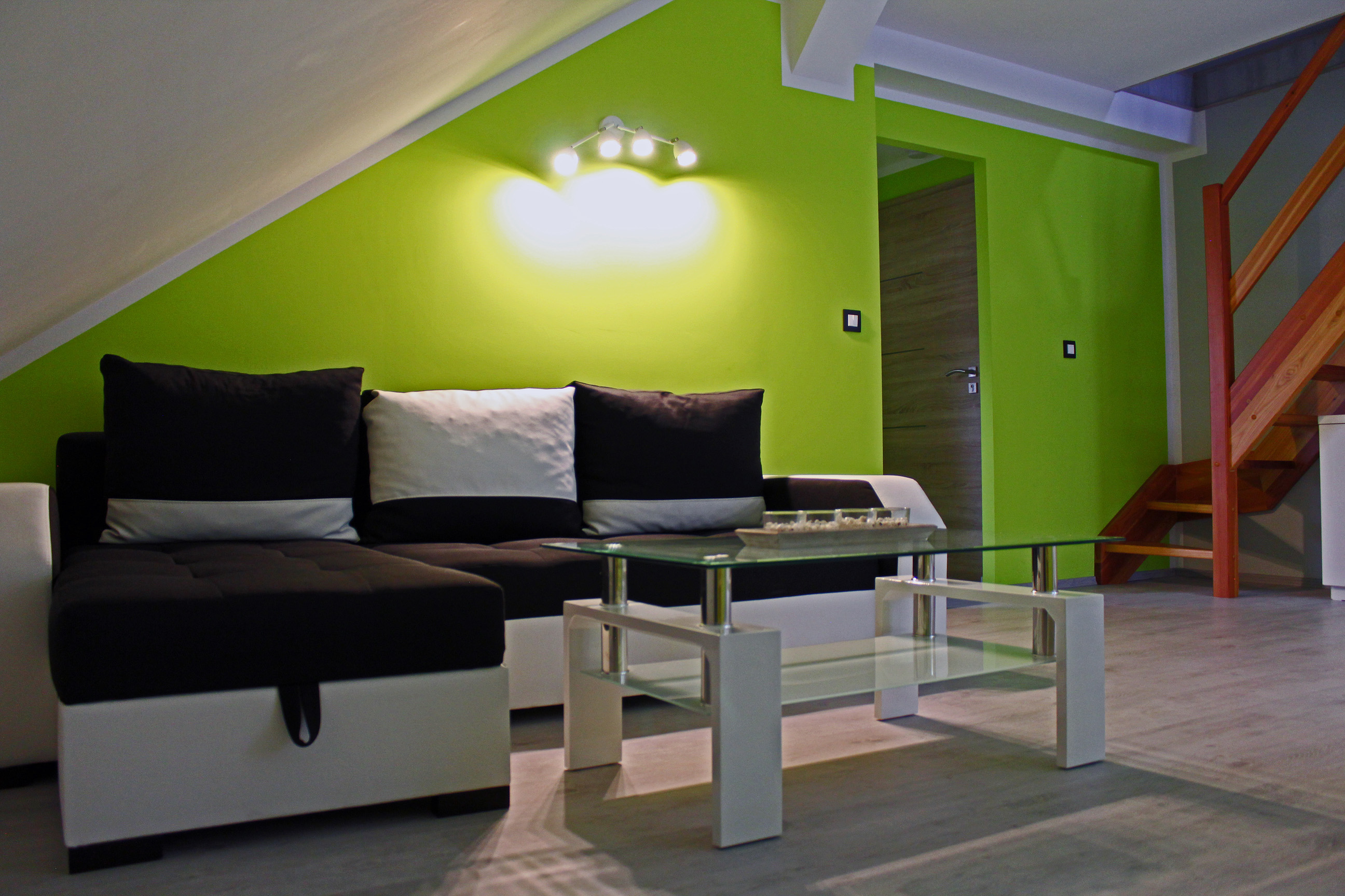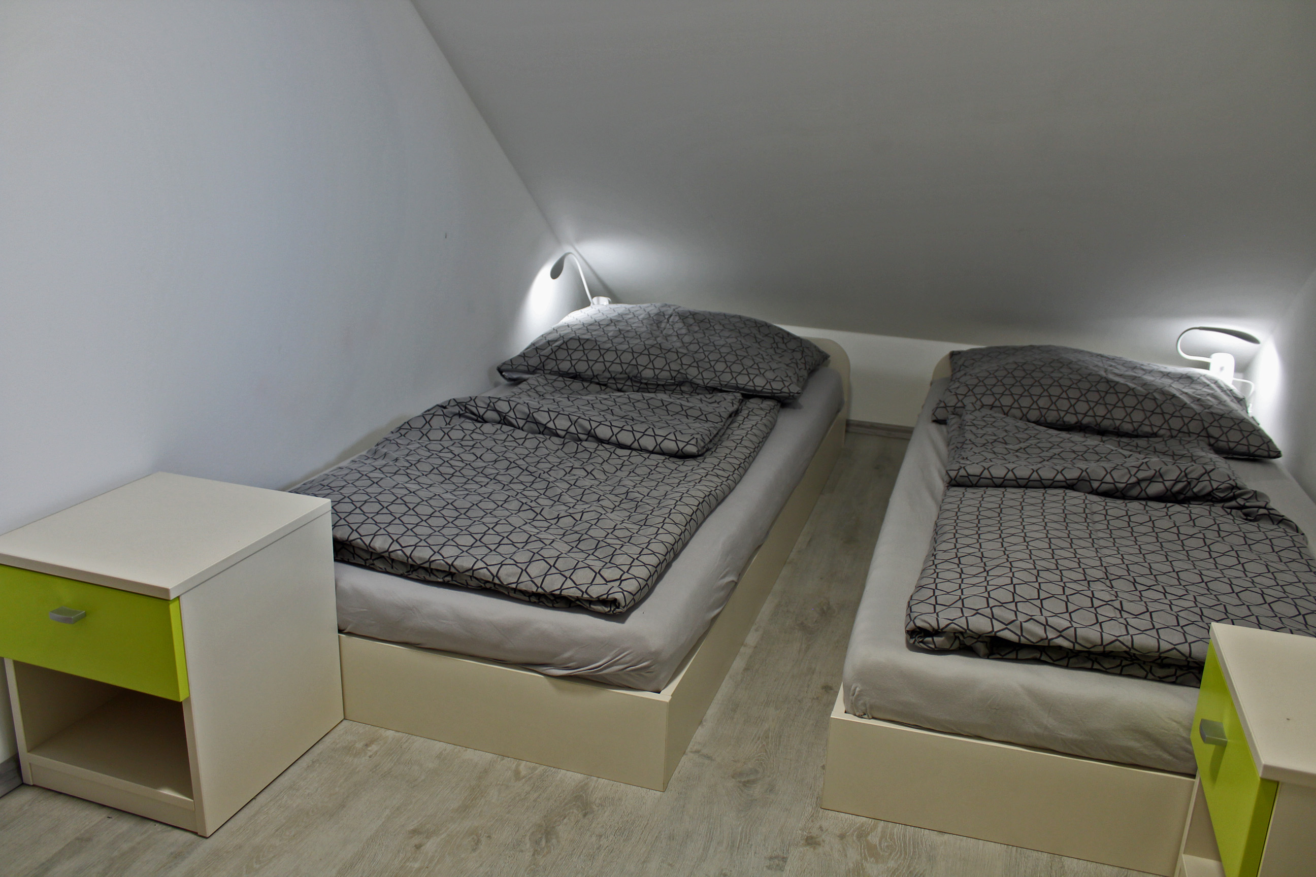 Apartmán SALApartmán SAL je plně vybavený mezonetový apartmán pro čtyři osoby. Apartmán je plně vybaven pro krátkodobý i dlouhodobý pronájem. Výbava apartmánu obsahje základní nádobí pro stolování a vaření, sporák, troubu, rychlovarnou konvici, mikrovlnku, lednici a pračku. V kuchyni lze nalézt jídelní kout pro čtyři osoby. Sociální zařízení obsahuje sprchový kout a wc. V apartmánu také naleznete TV a bezplatnou wifi. Z apartmánu je výhled na přírodní nádrž štěrkoviště. Spaní je realizováno v podkrovním patře na dvou postelích, které lze dle potřeby spojit, či rozdělit a jedné manželské posteli. |
