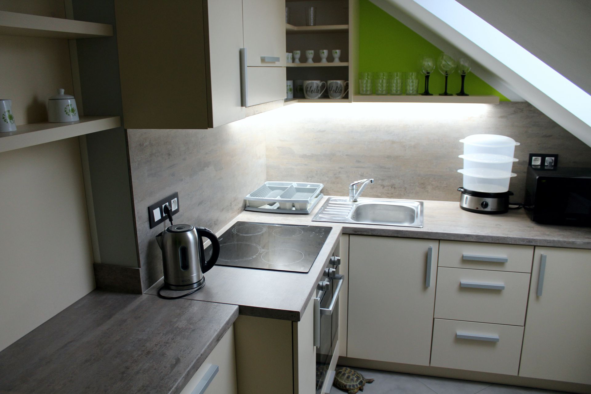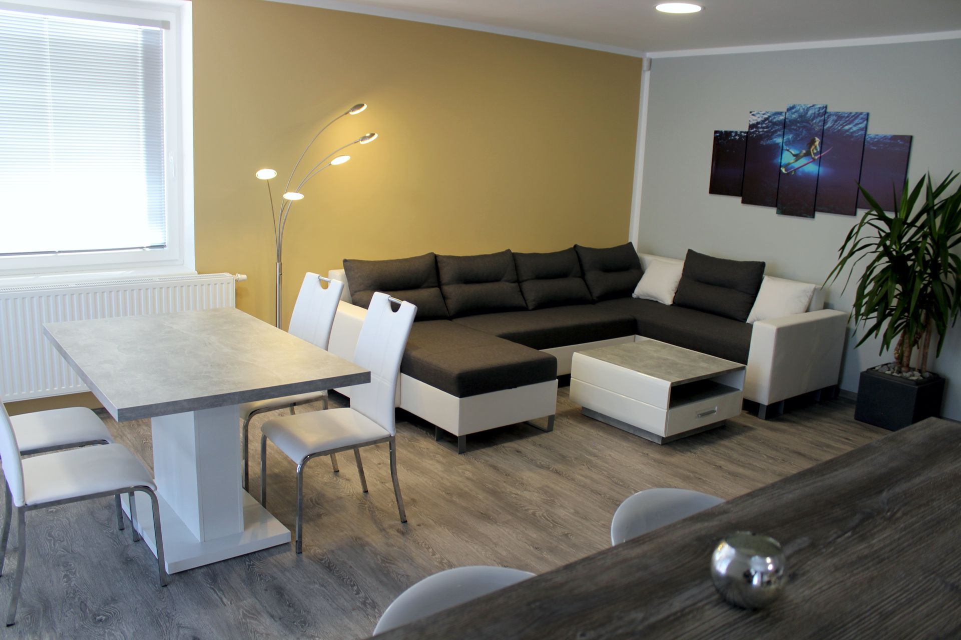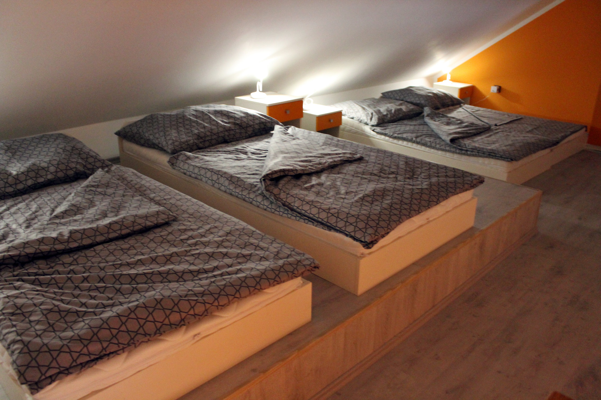 Apartmán SALApartmán SAL je plně vybavený mezonetový apartmán pro čtyři osoby. Apartmán je plně vybaven pro krátkodobý i dlouhodobý pronájem. Výbava apartmánu obsahje základní nádobí pro stolování a vaření, sporák, troubu, rychlovarnou konvici, mikrovlnku, lednici a pračku. V kuchyni lze nalézt jídelní kout pro čtyři osoby. Sociální zařízení obsahuje sprchový kout a wc. V apartmánu také naleznete TV a bezplatnou wifi. Z apartmánu je výhled na přírodní nádrž štěrkoviště. Spaní je realizováno v podkrovním patře na dvou postelích, které lze dle potřeby spojit, či rozdělit a jedné manželské posteli. |
