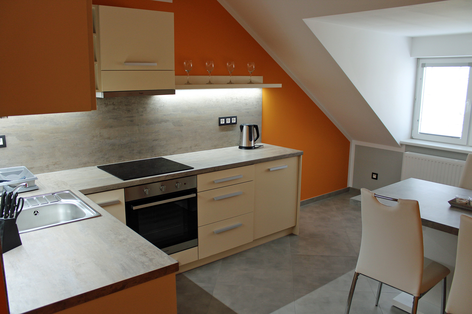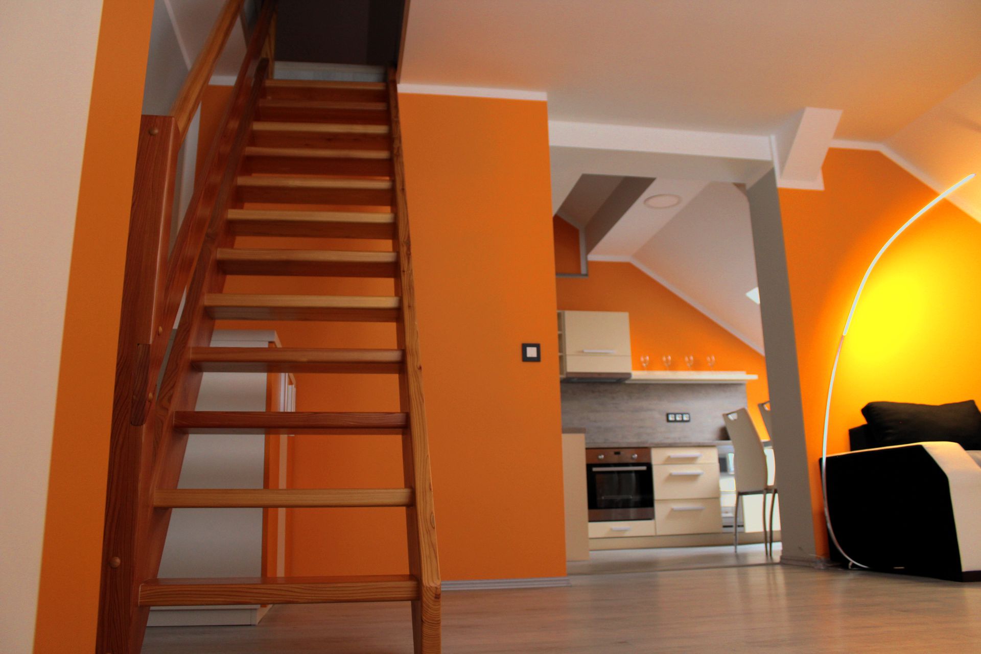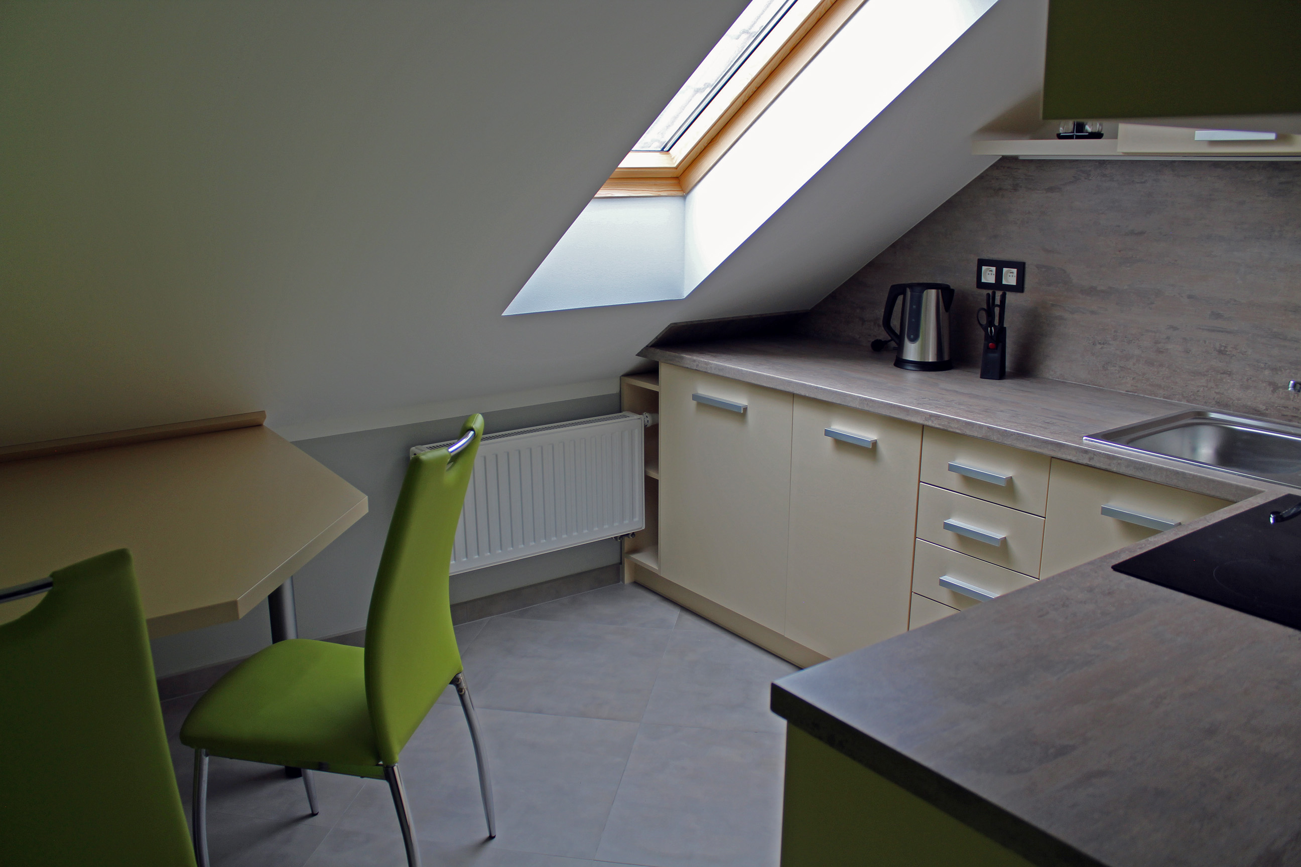 Apartmán MAIOApartmán MAIO je plně vybavený mezonetový apartmán pro čtyři osoby. Apartmán je plně vybaven pro krátkodobý i dlouhodobý pronájem. Výbava apartmánu obsahje základní nádobí pro stolování a vaření, sporák, troubu, rychlovarnou konvici, mikrovlnku, lednici a pračku. V kuchyni lze nalézt menší jídelní kout pro dvě osoby. Sociální zařízení obsahuje sprchový kout a wc. V apartmánu také naleznete TV a bezplatnou wifi. Spaní je realizováno v podkrovním patře na samostatných postelích, které lze dle potřeby spojit, či rozdělit. |